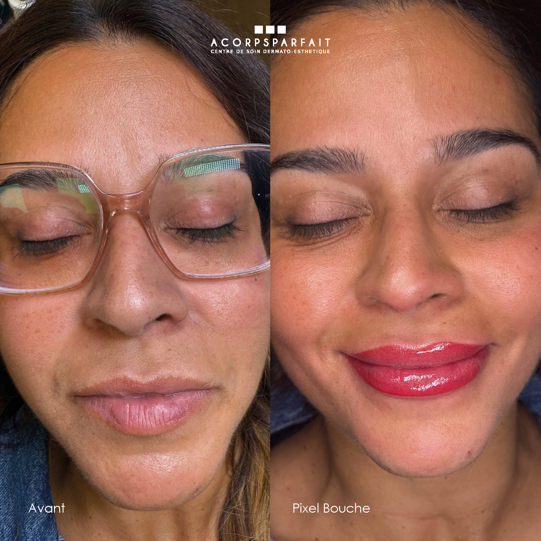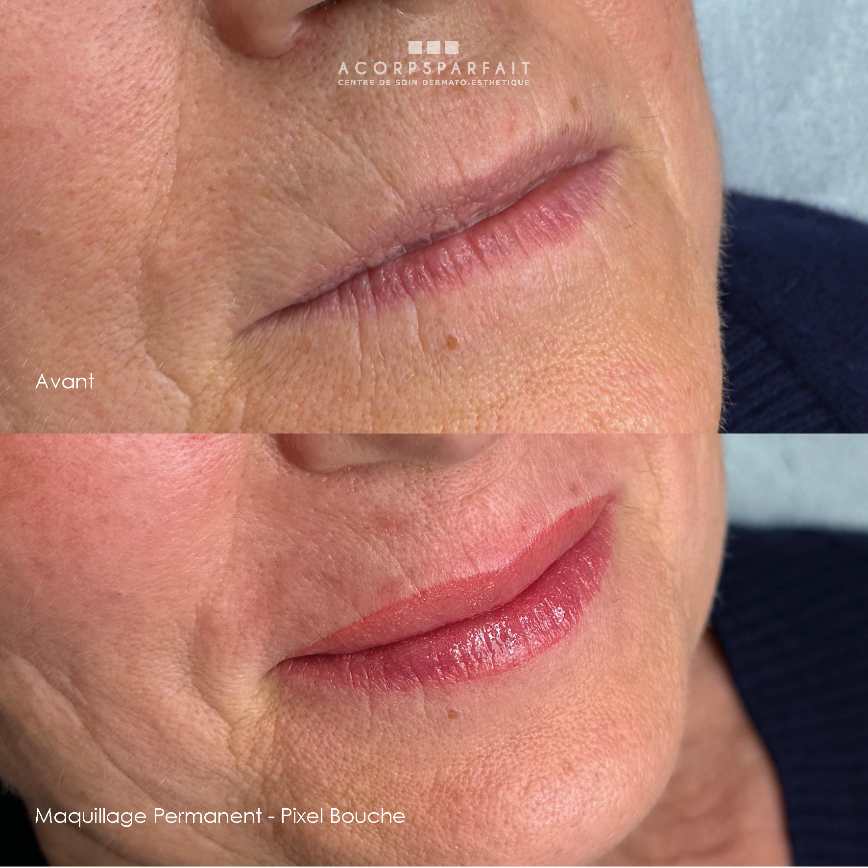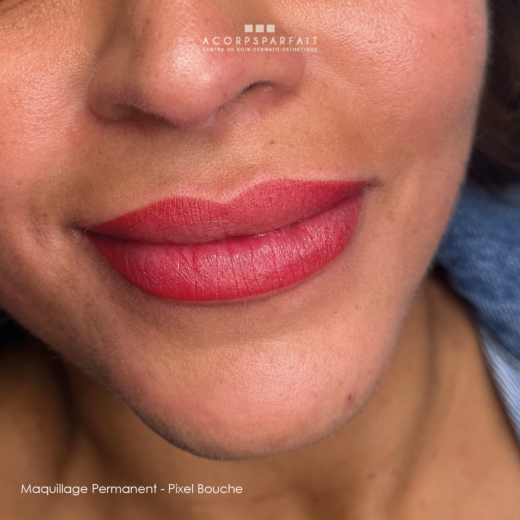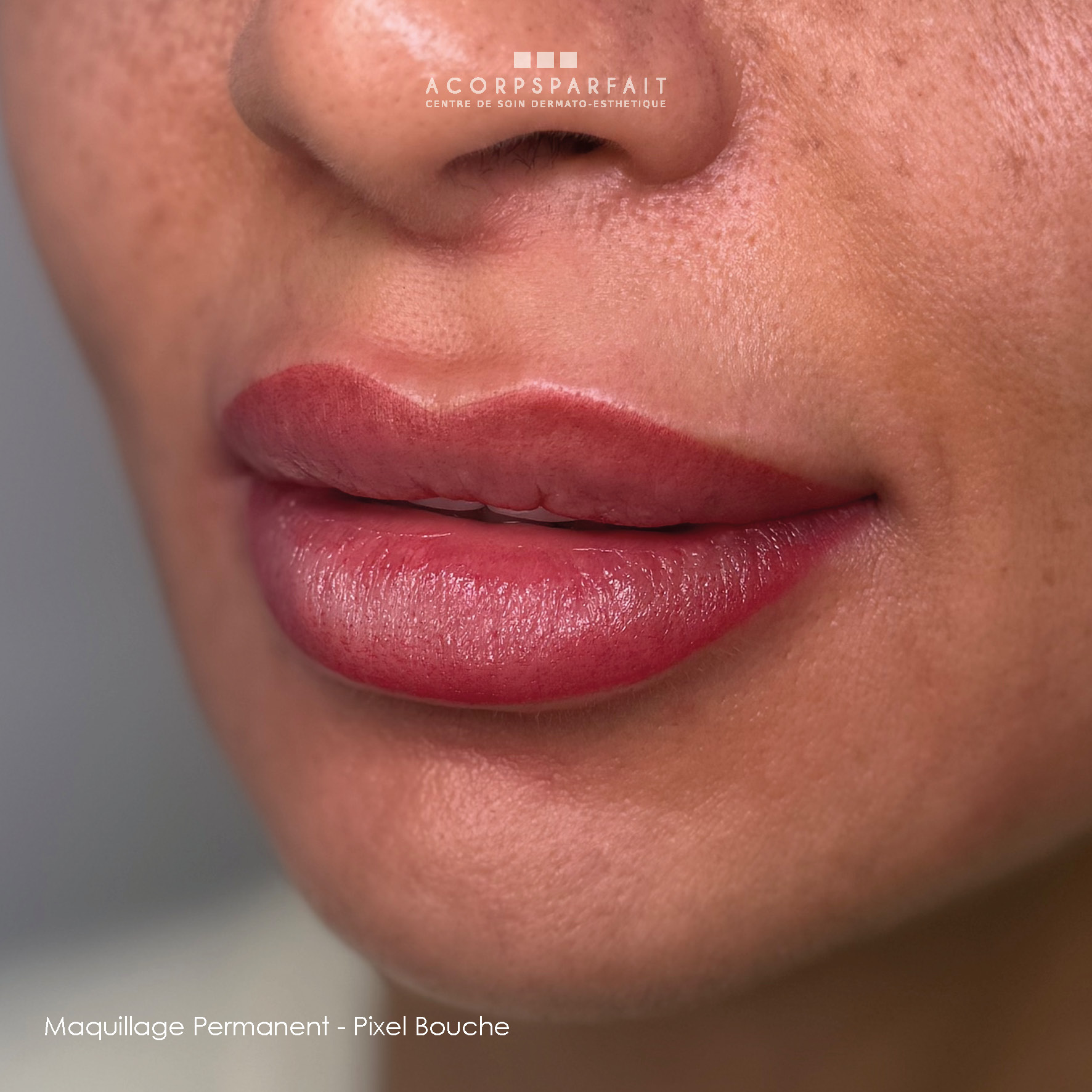 - Les lèvres : Trois techniques sont appliquées chez A Corps Parfait. Le contour des lèvres d’une teinte identique ou légèrement plus foncée que la couleur naturelle des lèvres permet de corriger une asymétrie éventuelle et de dessiner une jolie bouche. Effectué avec un effet ombrage en complément, ce type de maquillage semi-permanent apporte une sensation de volume. Le maquillage permanent « full lips » colore quant à lui l’intégralité des lèvres dans une teinte choisie pour un rendu naturel ou sophistiqué.