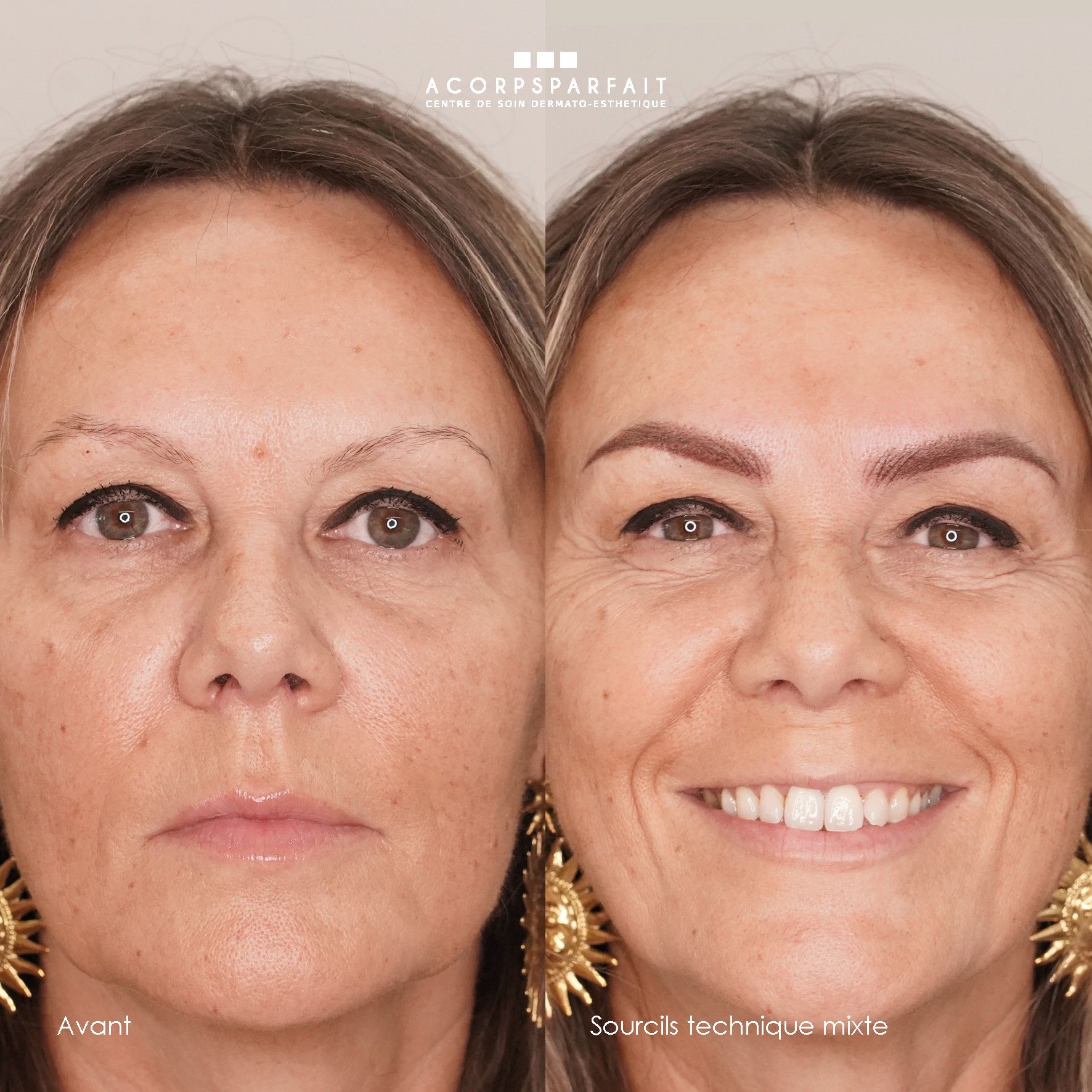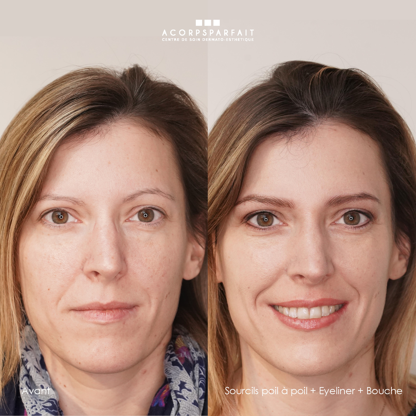 - Les sourcils : Différentes techniques spécifiques permettent de reproduire le tracé des poils selon l’effet désiré (sophistiqué, accentué, naturel) pour bénéficier de sourcils impeccables.